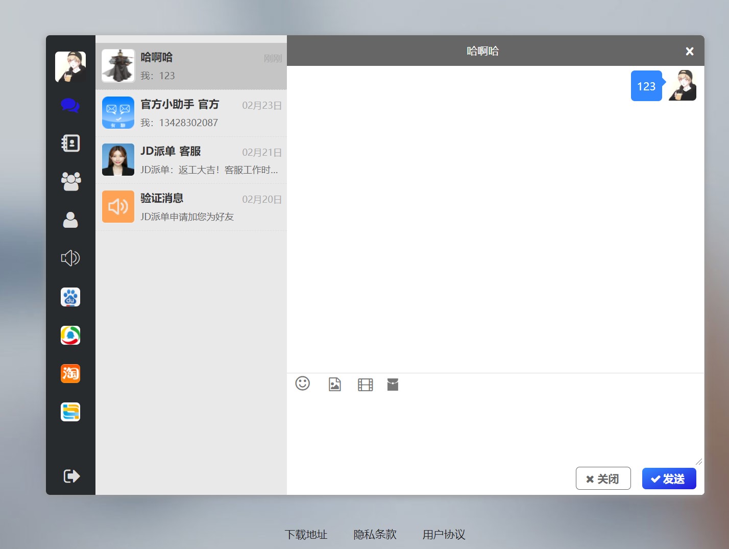 后台可以设置禁止发送或者屏蔽的关键词 内置浏览器可自动提取并打开超链接,单一的超链接可以提取到标题和简介, 消息记录支持服务器同步、支持pc和移动端同时登录,并接收消息 可以设置免打扰、置顶,可以手动删除。 |