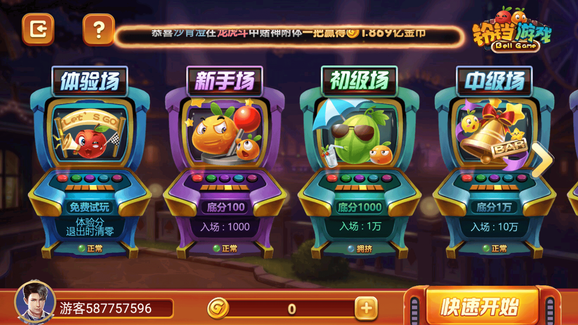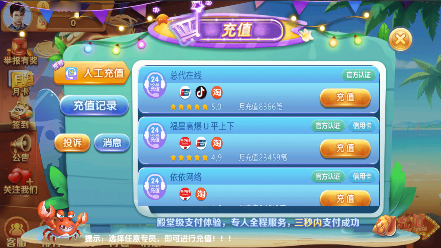 客户端UI界面是用了经典的325棋牌的UI,游戏分为多人,捕鱼,棋牌,电玩,休闲5个分类。看了下外面的正版63棋牌游戏运营了几年了,游戏相当不错。